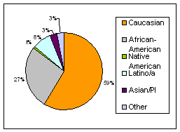 Of the 78 new clients: Caucasian (59%), African American (27%), Latino (8%), Native American (1%), Asian (3%) and other/mixed (3%). The percentage of new clients who are people of color in 2004 was 41%.