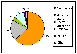Of all 1,523 clients: Caucasian (63%), African American (20%), Latino (9%), Native American (4%), Asian (2%), and other (2%). The cumulative percentage of clients who are people of color is 37%.