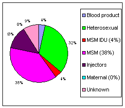 When other modes of transmission go up, there is a corresponding reduction in percentages represented by other risk groups. Injecting drug users made up only 17% of new clients (including 4% who are MSM and IDU) served in 2004; this percentage is down from 24% in 2004, 26% in 2000, and 37% in 1998.